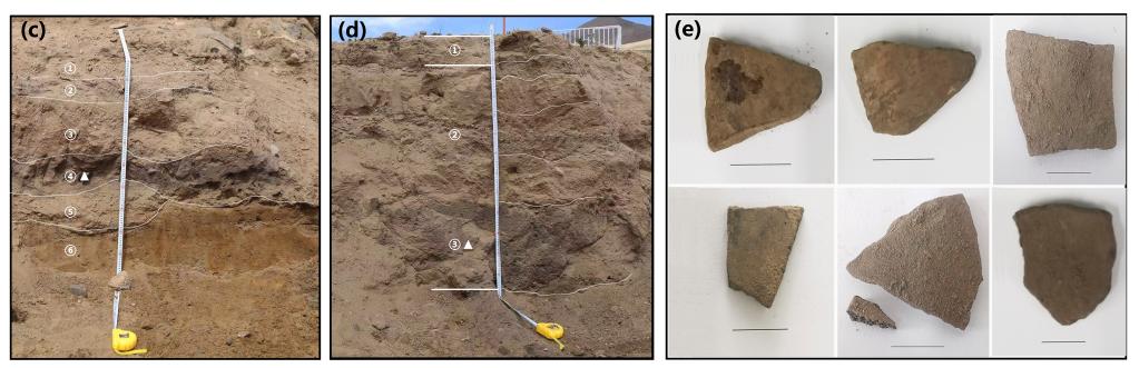 图(c)(d)分别为共塘遗址调查剖面1和剖面2地层(三角形表示陶片位置)。图(e)为本研究所分析的陶片照片。(资料图片由第二次青藏科考队“人类活动历史及其影响”分队提供)