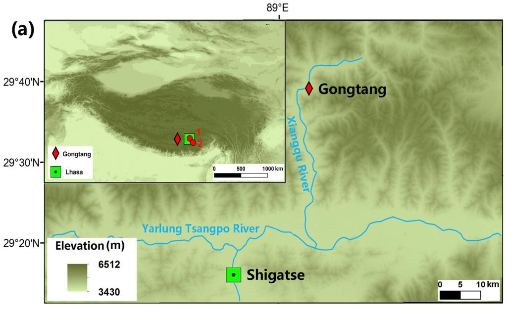 图(a)为雅鲁藏布江中游部分地区遗址背景资料图,曲贡(1)、邦嘎(2)和共塘遗址位置(红色菱形所示)。(资料图片由第二次青藏科考队“人类活动历史及其影响”分队提供)