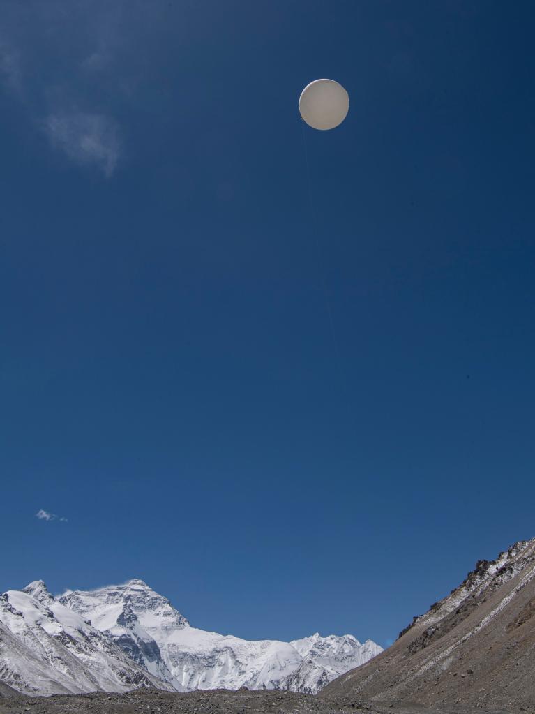 2022年5月3日,在珠峰登山大本营,科研人员施放的大气臭氧探空气球。(新华社记者孙非摄)