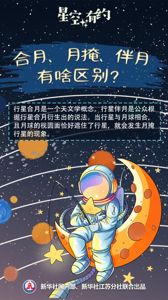与月球相关的天象很多,如行星合月、月掩行星、行星伴月等。它们有啥区别?王科超说,行星合月是一个天文学概念,指行星和月球的地心视赤经相同的一种特殊位置关系。行星伴月则是公众根据行星合月衍生出的说法,描述的是行星合月发生前后一段时间,行星和月球都看上去离得很近的“同框”画面。而当行星与月球相合,且月球的视圆面恰好遮住了行星,就会发生月掩行星的现象。