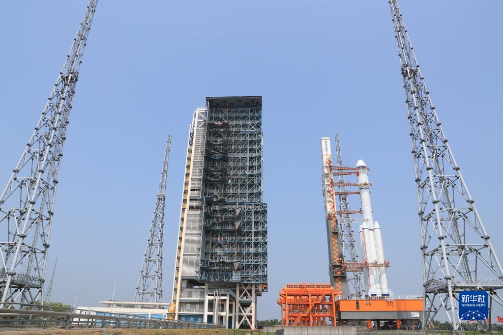 5月7日,天舟六号货运飞船与长征七号遥七运载火箭组合体垂直转运至发射塔架。 新华社发(黄国畅 摄)