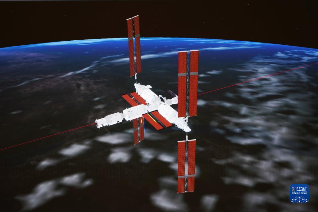 5月11日在北京航天飞行控制中心拍摄的天舟六号货运飞船与空间站组合体完成交会对接的画面。新华社记者 郭中正 摄