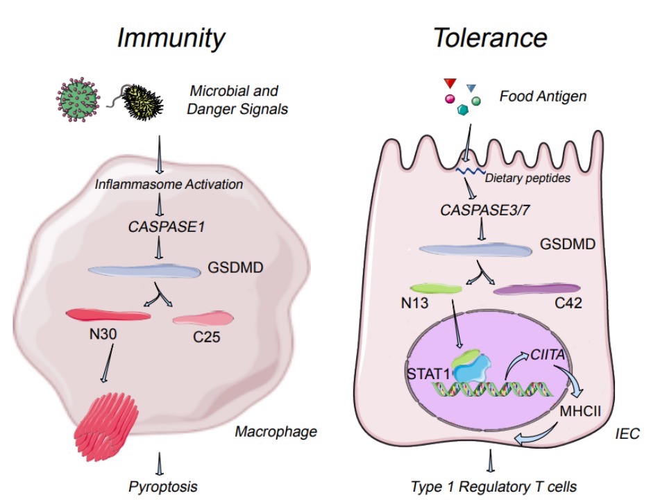 GSDMD分子在不同细胞中应对病原以及食物抗原示意图。(中国科学技术大学供图)