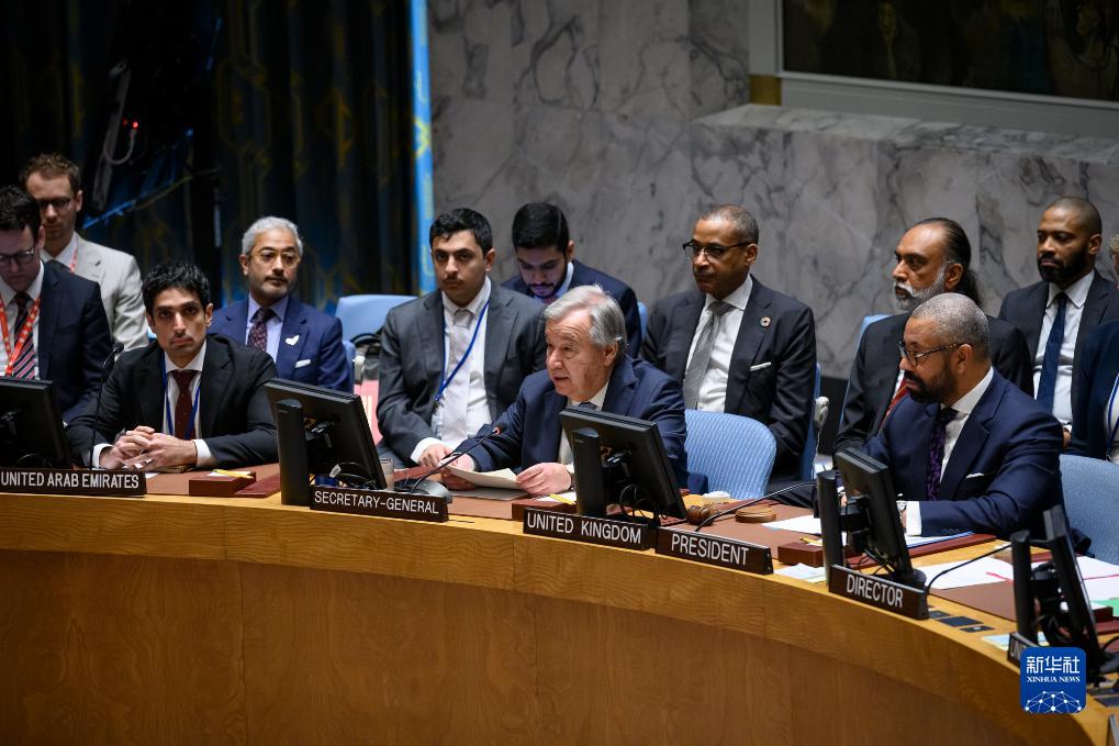 7月18日,联合国秘书长古特雷斯(前右二)在纽约联合国总部出席联合国安理会人工智能与安全问题高级别公开会时发言。新华社发(联合国供图/洛伊·费利佩摄)