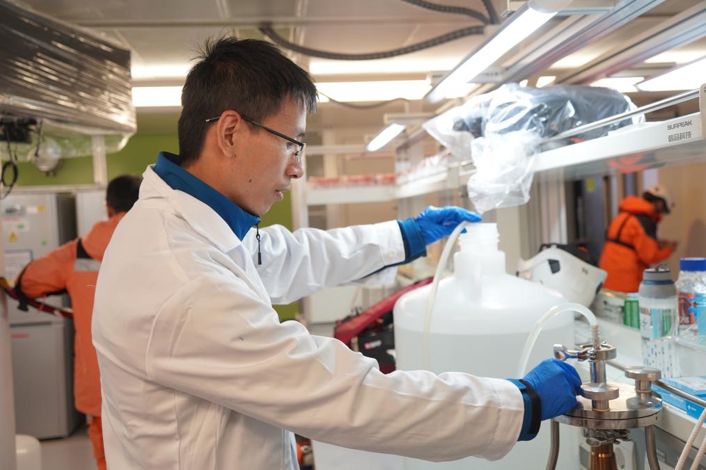 2023年7月26日,中国第13次北冰洋科学考察队队员在实验室中对采样海水进行处理。新华社记者魏弘毅摄