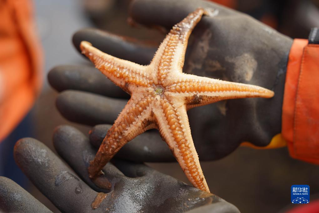 这是在底栖生物拖网作业结束后,科考队员从样品中搜索到的海星(8月4日摄)。新华社记者 魏弘毅 摄