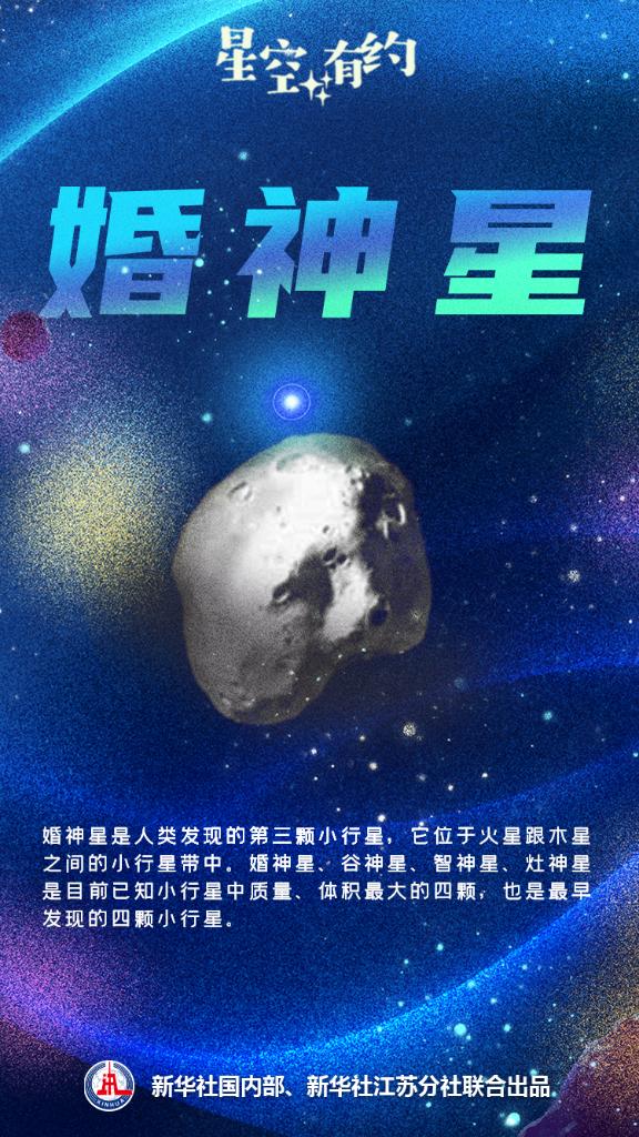 紫金山天文台科普主管王科超介绍,婚神星是人类发现的第三颗小行星,它位于火星跟木星之间的小行星带中。婚神星、谷神星、智神星、灶神星是目前已知小行星中质量、体积最大的四颗,也是最早发现的四颗小行星。但与月球比较,婚神星的“体形”小得多。再加上运行轨道距离太阳很远,婚神星的视星等在7.4至11.5等之间,仅用肉眼无法观测。