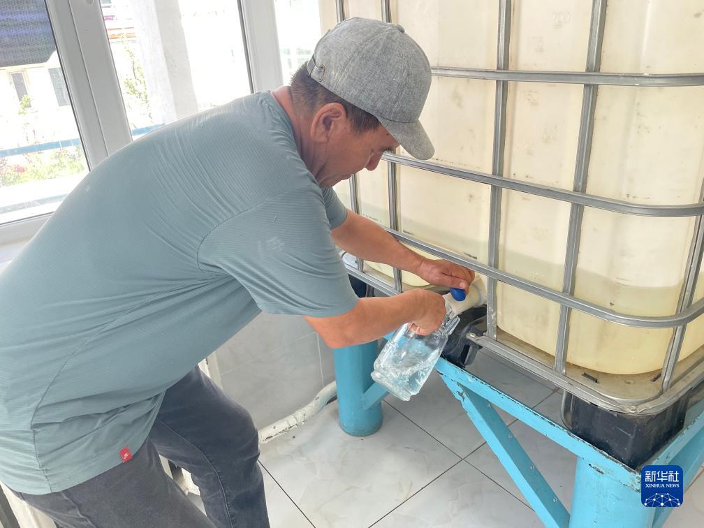 9月13日,在吉尔吉斯斯坦楚河州下塞拉菲莫夫卡养老院净水站,工作人员接取净化后的水。新华社记者 关建武 摄