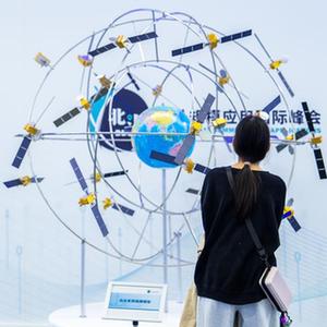 观众在第二届北斗规模应用国际峰会上观看北斗系统组网模型。新华社记者 陈思汗 摄