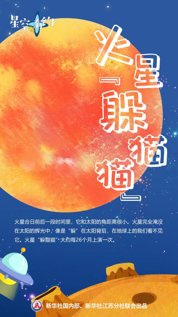 “具体来说,火星合日前后一段时间里,它和太阳的角距离很小。火星像是‘躲’在太阳背后,在地球上的我们看不见它。”王科超说,火星和地球每一轮会合周期中,都将迎来一次火星合日。二者平均会合周期约为780天,火星“躲猫猫”也大约每26个月上演一次。