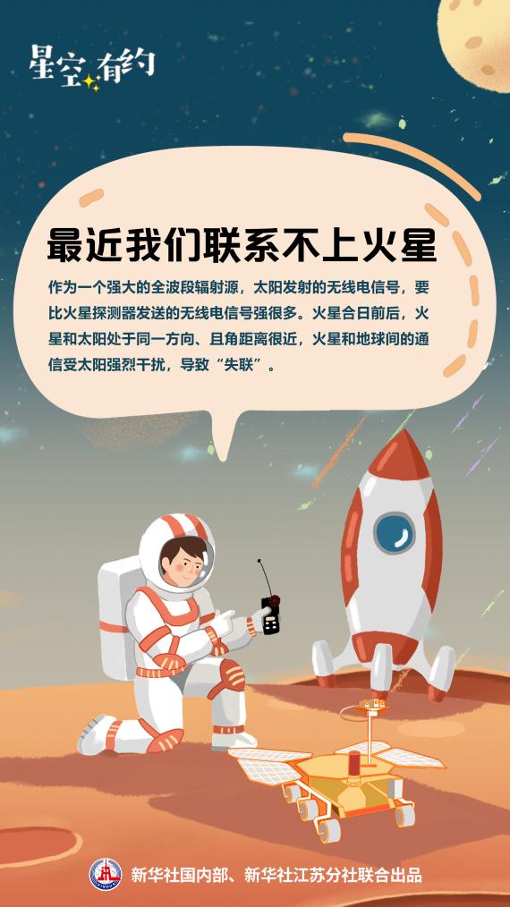 火星合日前后,我们不仅看不到火星,还将和它“失联”一段时间。王科超解释说,地球与火星上探测器的通信完全依靠无线电。作为一个强大的全波段辐射源,太阳发射的无线电信号,要比火星探测器发送的无线电信号强很多。火星合日前后,火星和太阳处于同一方向且角距离很近,火星和地球间的通信受太阳强烈干扰,导致“失联”。不过不用担心,“失联”期不会很长,持续时间约为火星合日前后的几周。