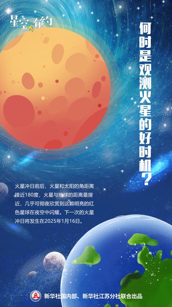 “火星冲日前后,火星和太阳的角距离接近180度,火星与地球的距离最接近,几乎可彻夜欣赏到这颗明亮的红色星球在夜空中闪耀。”王科超说,下一次的火星冲日将发生在2025年1月16日。