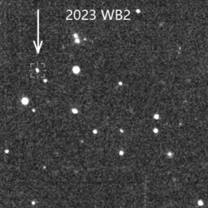 近地小行星2023 WX1和2023 WB2均是11月18日首次观测到,发现时的视亮度分别为20.8等和21.0等,视运动速度分别为0.513度/天和1.006度/天。累积了多个观测站的观测数据后,2023 WX1和2023 WB2的轨道已经确定。其中2023 WX1与地球的最小轨道交会距离为0.0416个天文单位,预估直径约170米。