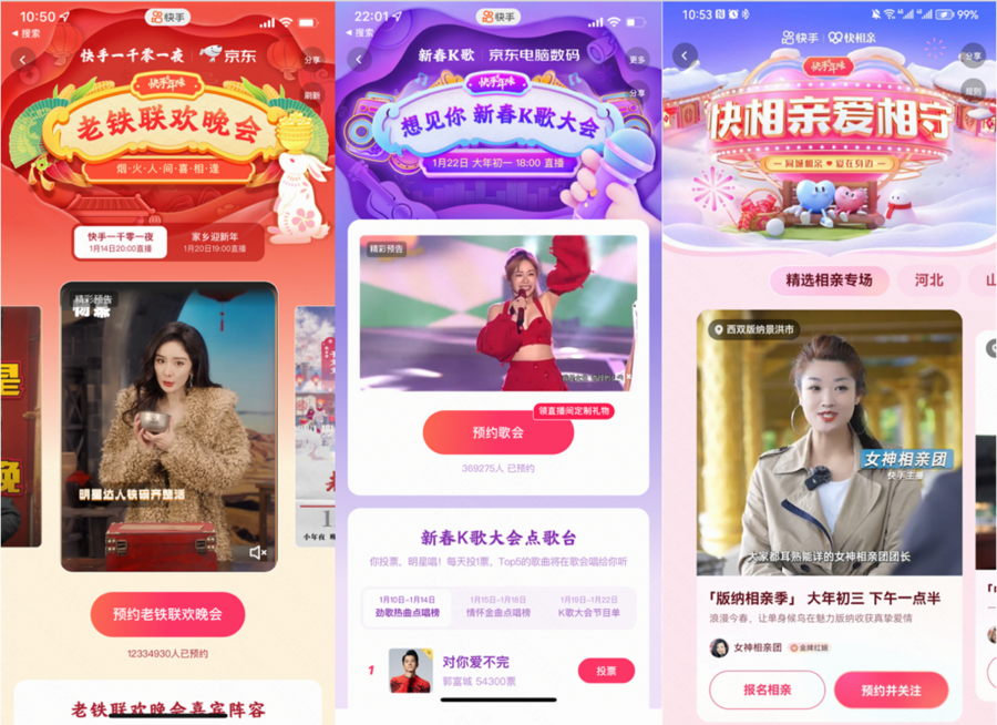 1月22日大年初一,快手还将上线全网首个互动直播歌会“想见你新春K歌大会”,这将是一场用户自定义选择歌单的老友KTV歌会,以“晚会+真人秀”的演出形式呈现,不仅将线下KTV欢唱场景搬至线上,还将由老铁票选“新春佳节”最想听的经典金曲。届时将有15组明星携劲歌热曲,在6大主题KTV包厢带用户嗨唱一整晚,同时节目歌曲演出顺序、下一首去哪个KTV包厢,将由用户在直播评论区决定。