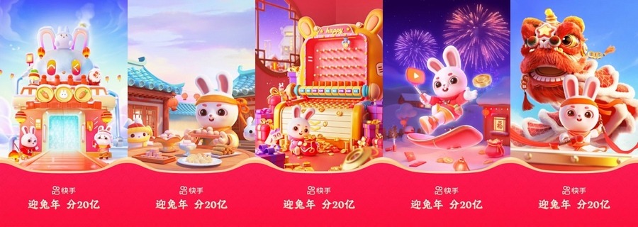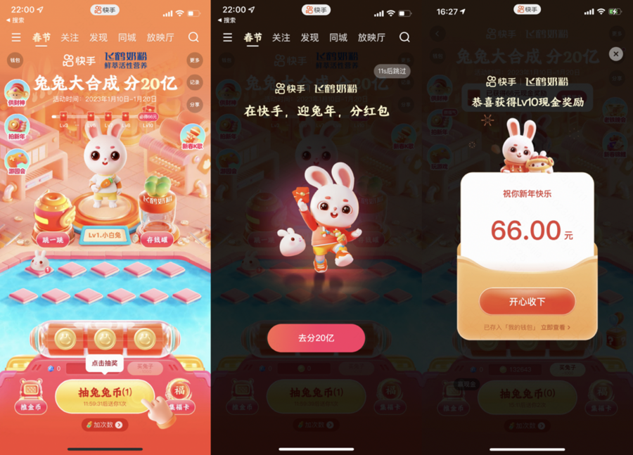1月10日晚8点起,快手红包活动上线,用户登录快手,点击屏幕上方的“春节”即可进入活动主会场,兔兔大合成、集福卡、跳一跳等众多玩法均有大额红包和好礼送上。
