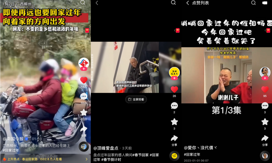在快手#回家过年#话题视频标签页,不少老铁记录下了自己的返程故事:摩托车返乡大军拉着妻儿踏上归途;满头银发的外公在地铁口等到外出务工的外孙女;儿子开车1136公里带爷奶回家,只为给爸妈惊喜......“即使再远也向着家的方向”“心的方向便是家的方向”“回家过年是人类最顽固又最美好的事情”,无数条感人肺腑的视频文案、评论,以及数亿频次播放量,都代表着行走在路上,时光在变,但人们对于年味和团圆的期盼未变。