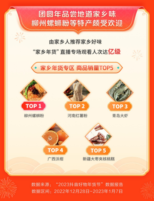 团圆年里少不了来自家乡的味道。抖音电商在年货节期间重点打造了家乡年货会场,由各地电商达人推荐自己家乡的特色货品,让大众通过一方屏幕就能体验到浓浓的家乡味。家乡年货直播间吸引了众多消费者关注,直播观看人次达亿级。