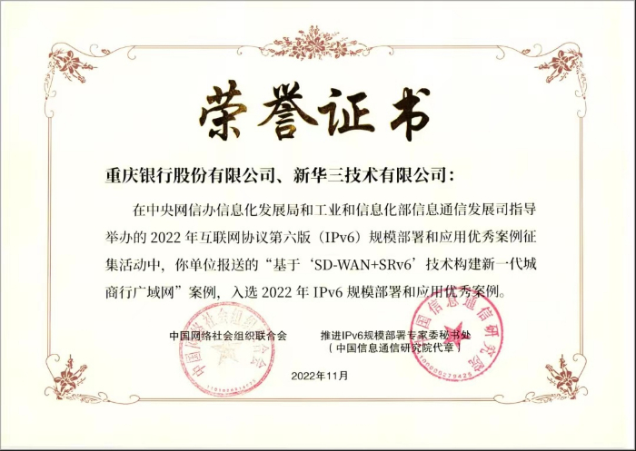 近日,2022年互联网协议第六版(IPv6)规模部署和应用案例征集活动入选名单正式公布,重庆银行联合紫光股份旗下新华三集团,以卓越的网络融合创新能力,凭借“基于‘SD-WAN+SRv6’技术构建新一代城商行广域网”案例成功入选2022年全国优秀案例。