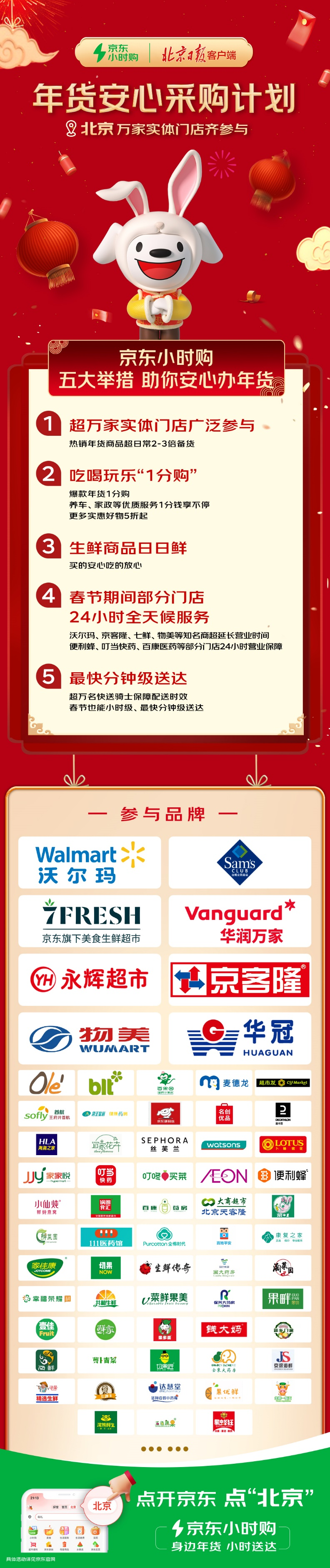 春节将至,为助力北京地区的消费者能更加省心、踏实地置办年货,轻松过好年。1月16日,京东小时购联合《北京日报》共同发起年货“安心采购”计划,携手北京地区超万家门店,通过提升商品备货量、延长门店运营时间、加强运力保障、春节也送货等一系列举措,全面助力定位在北京的消费者安心采购年货,活动持续至1月28日。