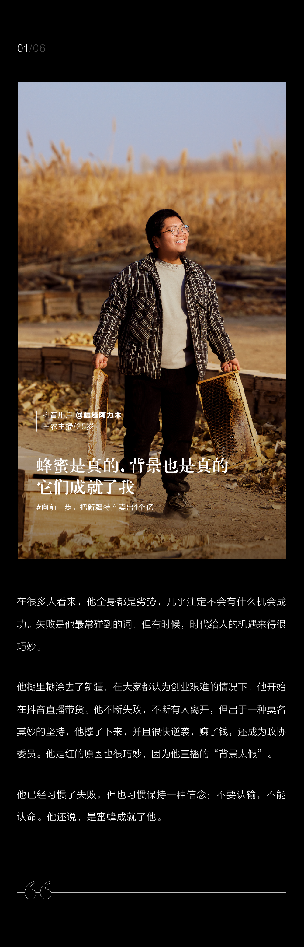 他去了新疆,期间开始在抖音直播带货。他已经习惯了失败,但也习惯保持一种信念:不要认输,不能认命。他还说,是蜜蜂成就了他。