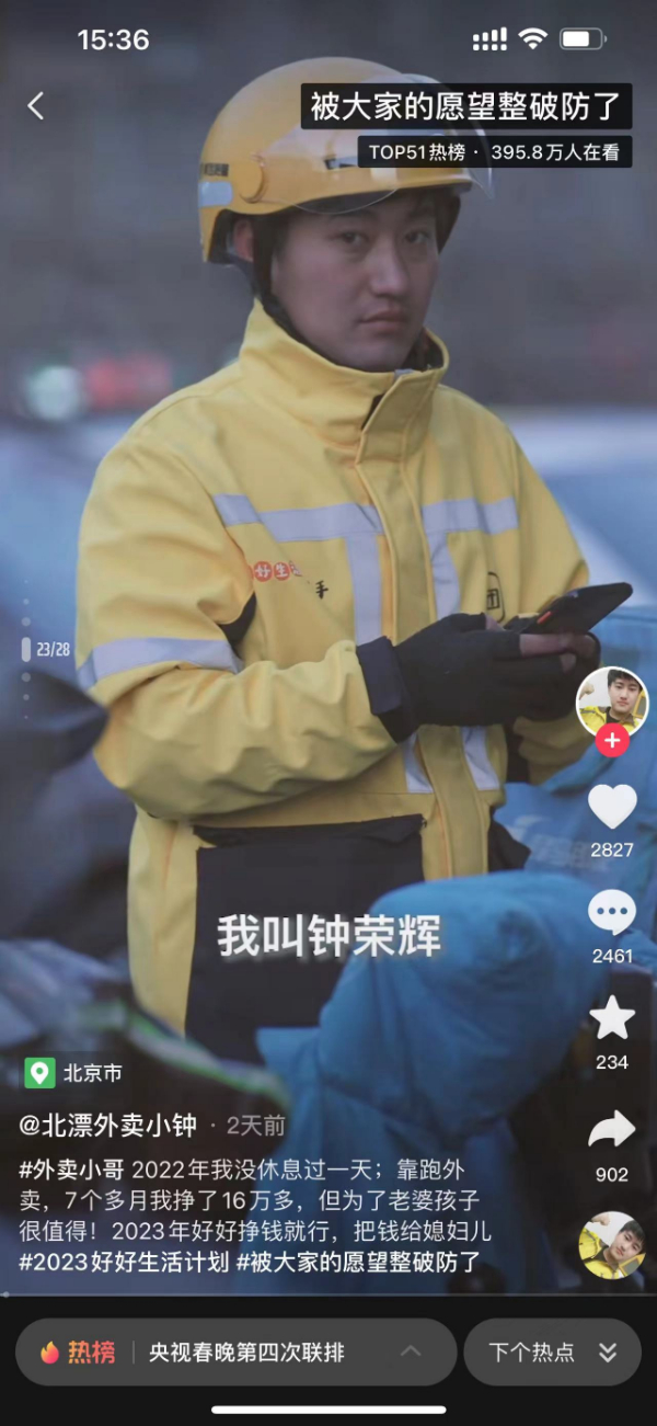 近日,《2023好好生活计划》暖心上线,聚焦来自不同城市、不同行业的“普通人”。这些人里有武汉医生、边境联防工作者、建筑工人、外卖小哥、网约车司机、农村合作社支书、大排档小老板、电商从业者、普通演员……在这支片子里,他们分享了2022年的遗憾和快乐,同时表达了对2023年的期盼和祝福。仅在两天时间,《2023好好生活计划》便获得千万级别播放量。