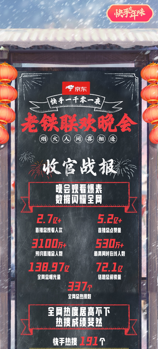 据悉,本次快手“铁晚”直播间首播总观看人次达2.7亿,直播间总点赞量高达5.2亿,最高同时在线人数达530万。其中,催人泪下的《一封家书》、聚焦平凡大众的《蚂蚁蚂蚁》、唱出东北儿女情的《送情郎·东雪》等优质节目更是引发人民日报、中国新闻网等官媒点赞。整场晚会以“烟火人间喜相逢”为主题,在推陈出新的同时引发用户热烈讨论,最终带来全网总热搜数337个,全网总曝光量达138.97亿,晚会热度燃爆全网,相关话题强势刷屏。