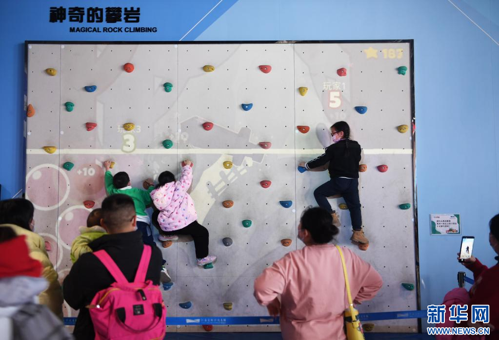 1月27日,小朋友在河南省科技馆新馆“创享空间”展厅体验攀岩项目。当日是春节假期最后一天,许多市民和学生走进河南省科技馆新馆,感受科技魅力,丰富假期生活。新华社记者张浩然摄pagebreak