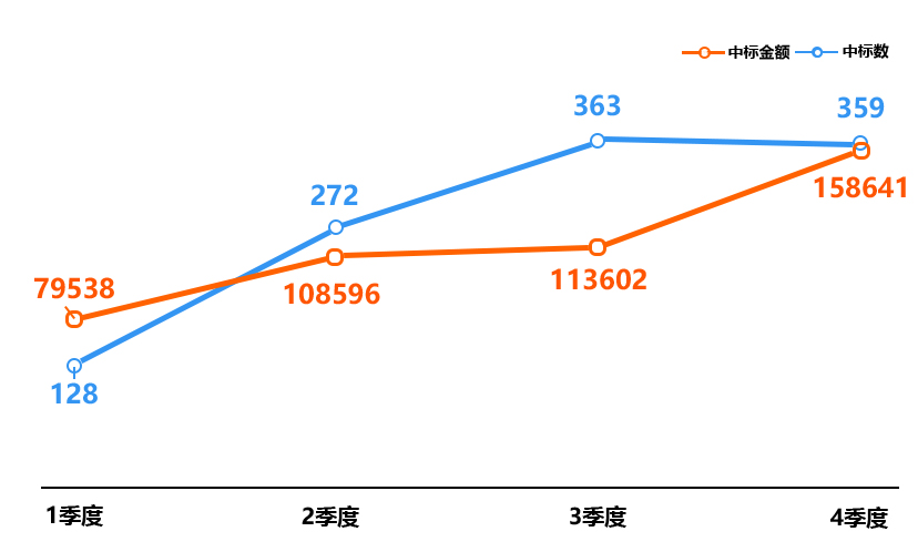 2022年中国5G相关建设项目中标金额/数量季度走势图(万元,个)