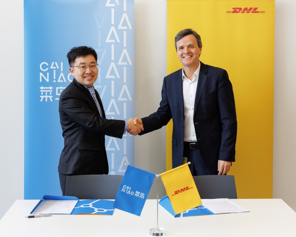 菜鸟首席战略官、欧洲与东南亚大区总经理熊伟与DHL电商解决方案公司的CEO Pablo Ciano签约现场