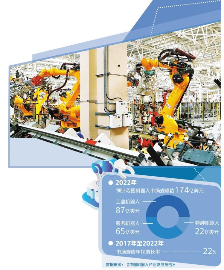多重因素助推我国机器人产业高速发展。2022世界机器人大会上发布的《中国机器人产业发展报告》预计,2022年中国机器人市场规模将达174亿美元,2017年至2022年年均增长率达22%。其中,2022年工业机器人市场规模有望达87亿美元,服务机器人市场规模有望达65亿美元,特种机器人市场规模有望达22亿美元。