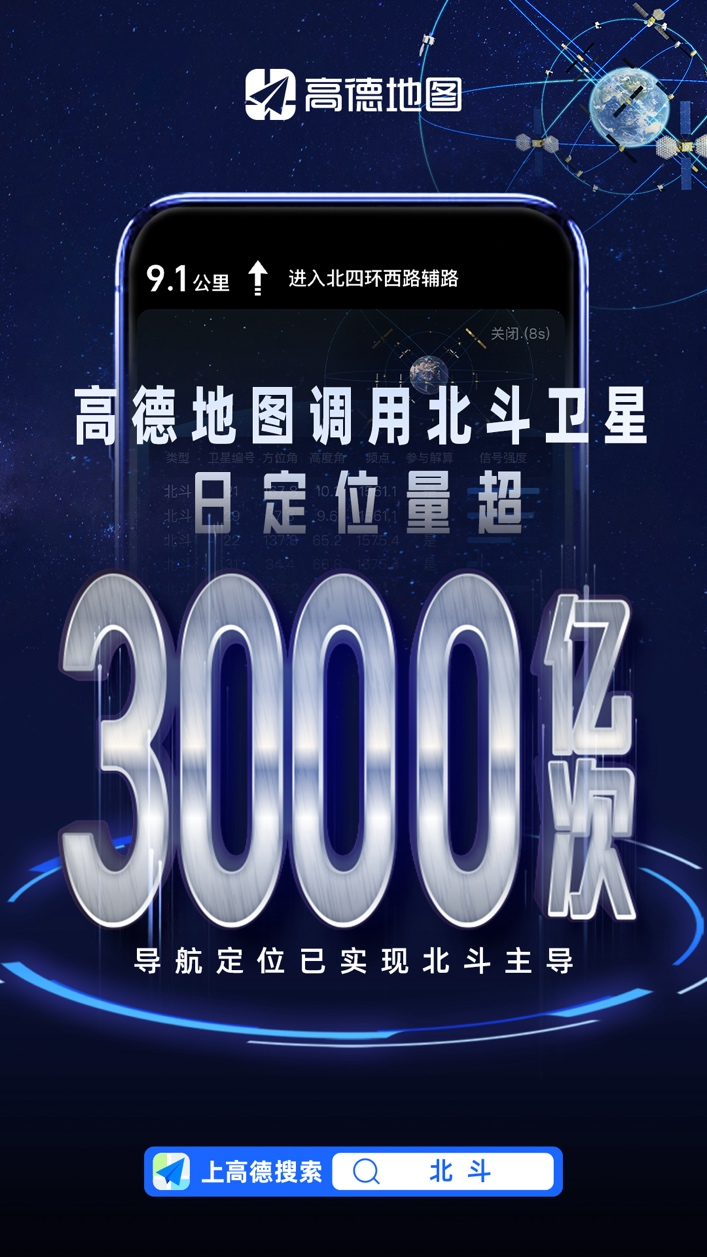 截至2023年1月的最新数据,高德地图调用北斗卫星日定位量已超过3000亿次,创造了历史新高。