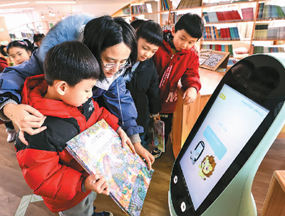 江苏省常州市新北区龙虎塘街道中心幼儿园(盘龙新区)依托当地智能传感特色产业的科技力量,设计建造了“智趣育”校园,孩子们可以在教室、活动室、阅览室等场所体验到科技的智能乐趣。图为老师在指导小朋友通过“人脸识别+语音互动”的云上借阅系统借阅图书。新华社记者 杨 磊摄