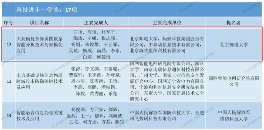 2022中国电子学会科学技术奖2月21日揭晓。由北京邮电大学、蚂蚁集团等主导研发的“大规模复杂异质图数据智能分析技术与规模化应用”等17项技术成果获科技进步一等奖。