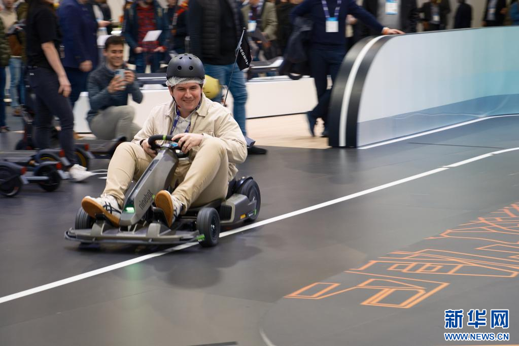 2月28日,一名男子在西班牙巴塞罗那举行的2023世界移动通信大会上体验电动卡丁车。