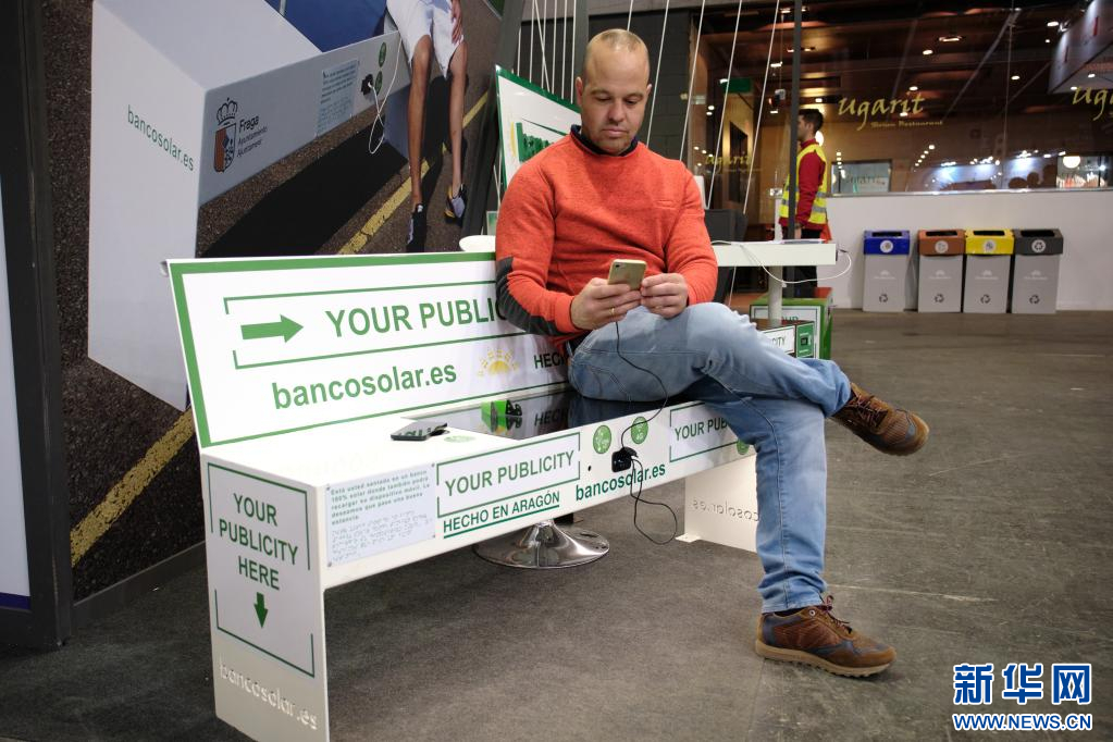 2月28日,一名男子在西班牙巴塞罗那举行的2023世界移动通信大会上体验太阳能充电长椅。