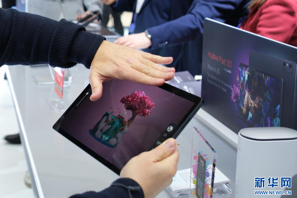 2月28日,参观者在西班牙巴塞罗那举行的2023世界移动通信大会上体验裸眼3D平板电脑。