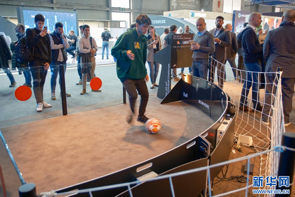 2月28日,一名男子在西班牙巴塞罗那举行的2023世界移动通信大会上体验智能足球测试设备。
