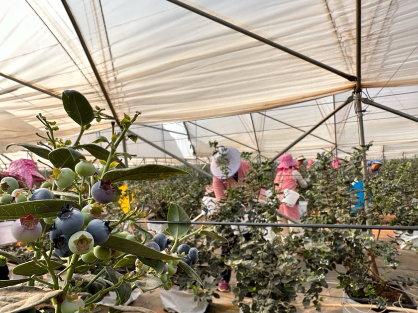 图为云南建水的果农在大棚里采摘蓝莓