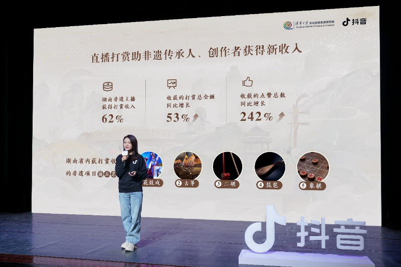 依托直播、短视频,非遗传承人在数字时代“乘风破浪”,在抖音等平台开设直播间进行文化展演,令非遗焕发出青春活力与光彩。3月13日,“非遗主播沙龙”在湖南大剧院举办。抖音直播业务代表肖妍介绍,过去一年,湖南省内非遗类直播累计超15万场,该类直播观看次数超6.4亿;1.7万 名湖南非遗主播在抖音开播,累计开播时长超293万小时。其中,62%主播获得打赏收入,收获打赏金额同比增长53%。