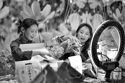 直播带货的健康发展,需要平台企业、网络用户、消费者、监管者各方凝聚共识,一起推动规范经营。图为2022年8月,国家会展中心(天津)中国网络文明大会参会人员在现场进行网络直播带货。(资料照片)