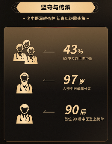 2023金扁鹊中医百强榜入榜中医年龄构成, 60岁及以上老中医占比43%,入榜中医最年长者97岁,可谓“宝藏老中医”。同时,也有90后中医登上榜单,在口碑好中医的队列里崭露头角。
