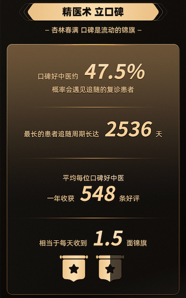 杏林春满,口碑是流动的锦旗。调查发现,患者之间口碑相传是“好中医”受到认可的主要方式。据榜单数据显示,口碑好中医约有47.5%的概率会遇见追随的复诊患者,最长的患者追随周期长达2536天,平均每位口碑好中医一年收获548条好评,相当于每天收到1.5面锦旗。