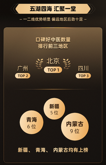 优质的中医医疗资源主要集中在一二线城市。据上榜数据,北京、广州、四川拥有口碑好中医的数量位列前三。偏远地区上榜人数后劲十足,内蒙古、青海、新疆等地区均有口碑好中医上榜。