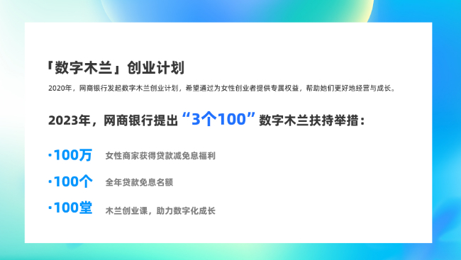 2023年,“数字木兰创业计划”再度升级,项目举措还包括为100万女性享受贷款减免息服务、每年提供100个女性全年贷款免息名额等。