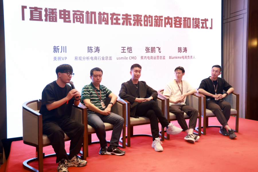 在研讨会的圆桌论坛上,美腕VP新川、易观分析电商行业总监陈涛,蕉内电商运营总监张鹏飞、usmile笑容加CMO王恺、blankme电商负责人陈涛齐聚一堂,围绕“新消费时代,品牌如何借助直播经济破圈与发展”主题展开深入交流,从直播电商机构、行业专家、品牌方等角度为行业市场提供了一线的实践经验。