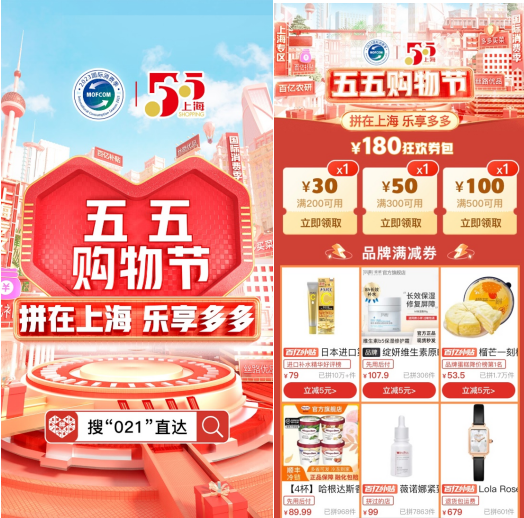 与此同时,“拼在上海 乐享多多”五五购物节专区也将在拼多多APP同步上线,并在专区首页设置了180元狂欢劵包,开启为期两个月的大型补贴让利活动。用户在拼多多APP上搜索021即可一键直达。
