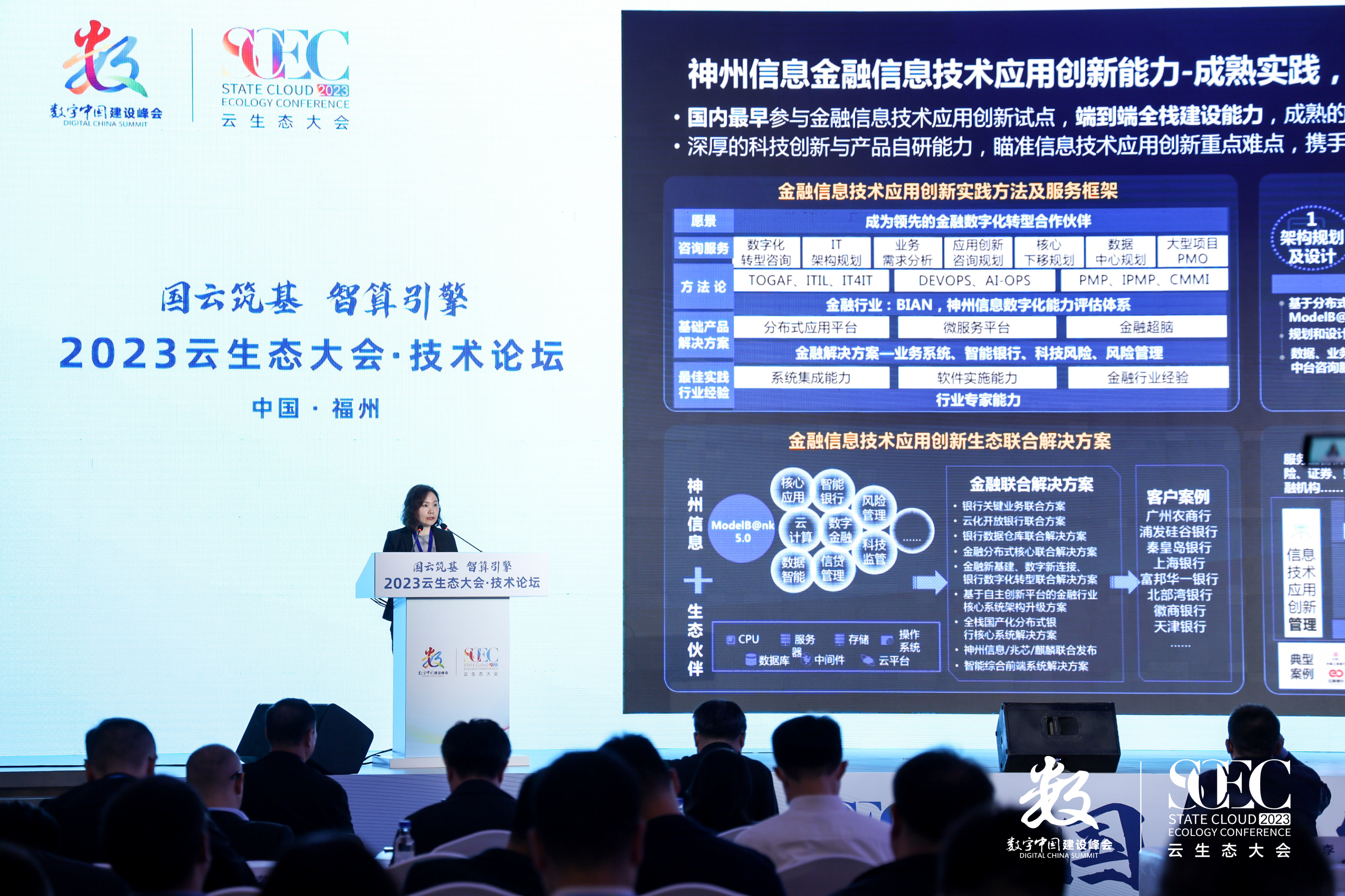 神州信息副总裁、服务BG总经理李侃遐在演讲中回顾了神州信息的起源和历程。她表示,神州信息最早成立的时候就以“数字中国”为名(英文名称:Digital China),立志通过“数字化”助力国家发展。四十年来,神州信息持续践行“数字中国”使命,不断以新技术、新产品、新服务、新模式,陪伴并服务了金融行业从“电算化”“信息化”走向“数字化”的整个发展历程,致力于成为领先的金融数字化转型合作伙伴。