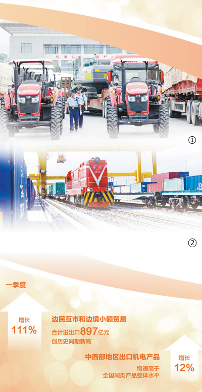 “十四五”规划纲要提出,推动边境贸易创新发展。近年来,随着中西部边境地区与周边国家和地区持续畅通贸易渠道、创新贸易方式,通过口岸开展的边境贸易规模稳定提升。海关总署发布的数据显示,一季度,边民互市和边境小额贸易合计进出口897亿元,创历史同期新高,增长111%。