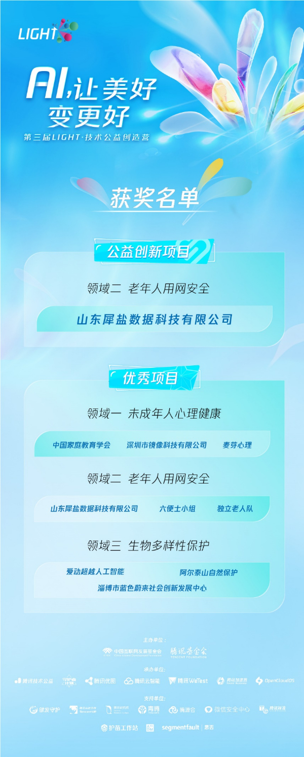 第三届Light共吸引1429支队伍报名参与公益提案,最终有136支队伍入围。路演现场,三大领域的入围队伍以更专业、更热情的态度,展示技术公益的个性化、多元化解决方案。经过专业评委现场评审,创造营最终获奖名单出炉:“未成年人心理健康”赛道的中国家庭教育学会、深圳市镜像科技有限公司、麦芽心理,“老年人用网安全”赛道的山东犀盐数据科技有限公司、六便士小组、独立老人队,“生物多样性保护”赛道的爱动超越人工智能、阿尔泰山自然保护、淄博市蓝色蔚来社会创新发展中心等众多队伍荣获优秀项目奖;其中,山东犀盐数据科技有限公司凭借“老年人用网安全”的创新探索,荣获公益创新项目奖。