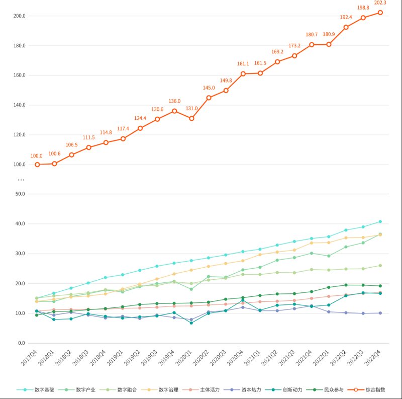 看大势,中国数字经济拾级而上、方兴未艾。自2017年第四季度以来,中国数字经济整体呈现蓬勃向上发展态势。2022年第四季度,总指数值达到202.3,首次突破200大关,是2018年第四季度的1.8倍。各项一级指标基本保持了良好增长势头,数字经济发展韧性与活力尽显。
